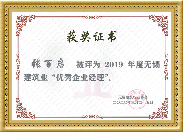 2020年,集团公司董事长张百启被评为2019年度无锡市建筑业“优 秀企业经理”