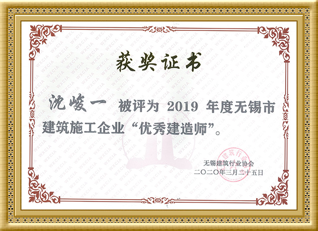 2020年,沈峻一同志被评为2019年度无锡市建筑施工企业“优 秀建造师”