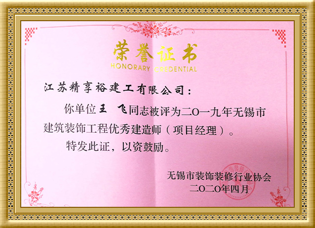 2020年,王飞同志被评为2019年度无锡市建筑装饰工程“优 秀建造师”