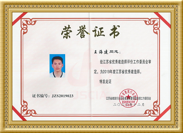 2020年,王海建同志被评为2019年度江苏省优 秀建造师