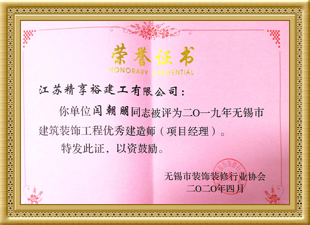 2020年,闫朝朋同志被评为2019年度无锡市建筑装饰工程“优 秀建造师”