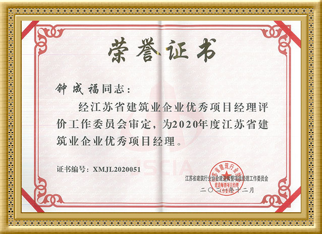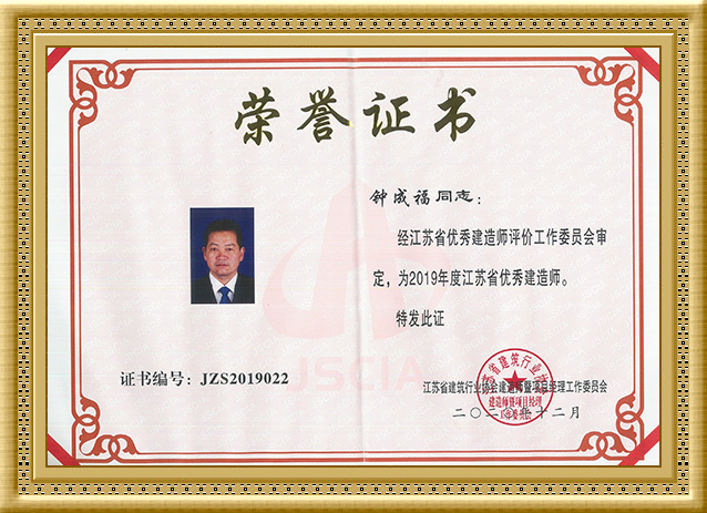 2020年,钟成福同志被评为2019年度江苏省优 秀建造师