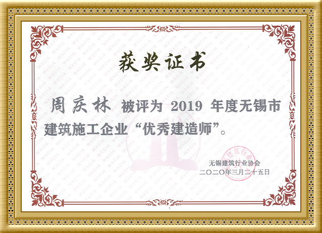 2020年,周庆林同志被评为2019年度无锡市建筑施工企业“优 秀建造师”