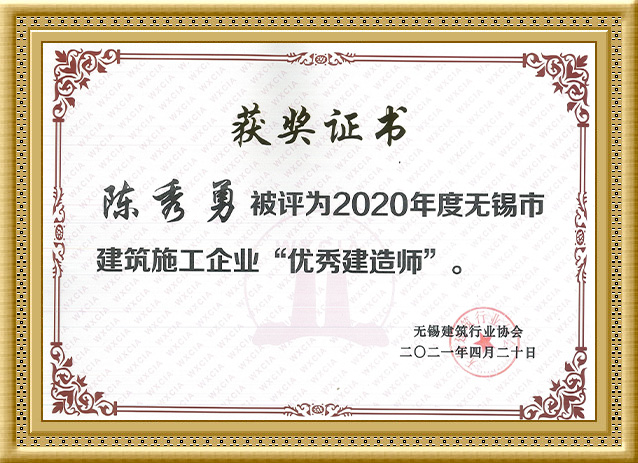 2021年,陈秀勇同志被评为2020年度无锡市建筑施工企业“优 秀建造师”