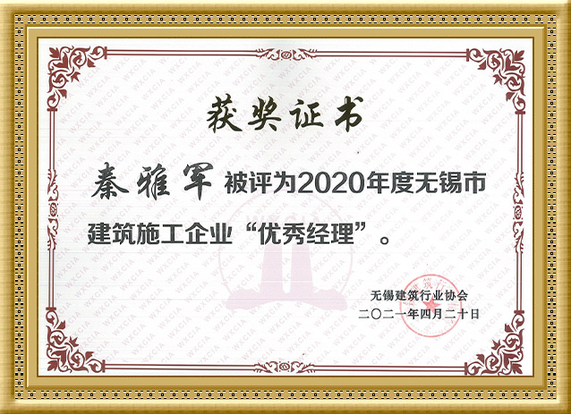 2021年,秦雅军同志被评为2020年度无锡市建筑施工企业“优 秀经理”