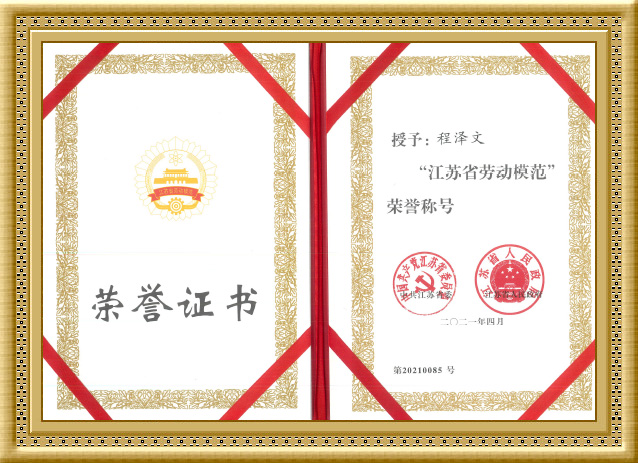 2021年,程泽文同志荣获“江苏省劳动模范”荣誉称号