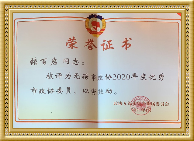 2021年,集团公司董事长张百启被评为无锡市市政协2020年度优 秀市政协委员