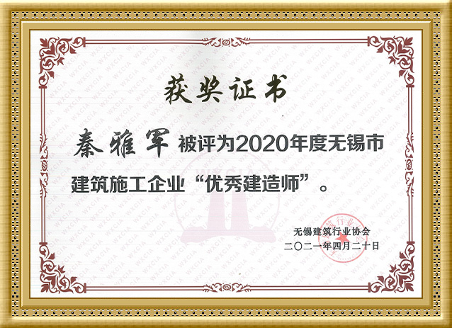 2021年,秦雅军同志被评为2020年度无锡市建筑施工企业“优 秀建造师”