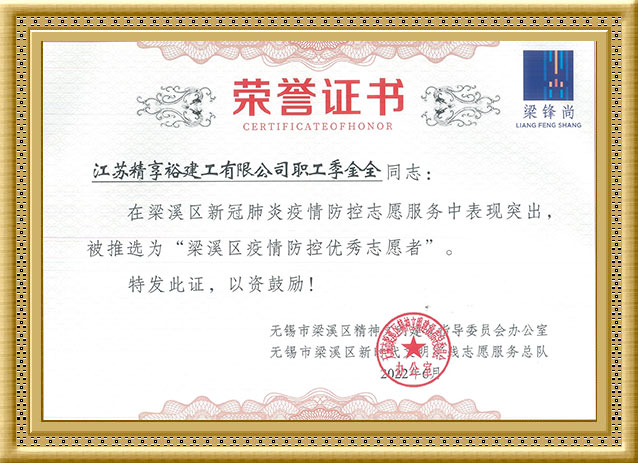 2022年,季金全同志荣获“梁溪区疫情防控志愿者”荣誉称号