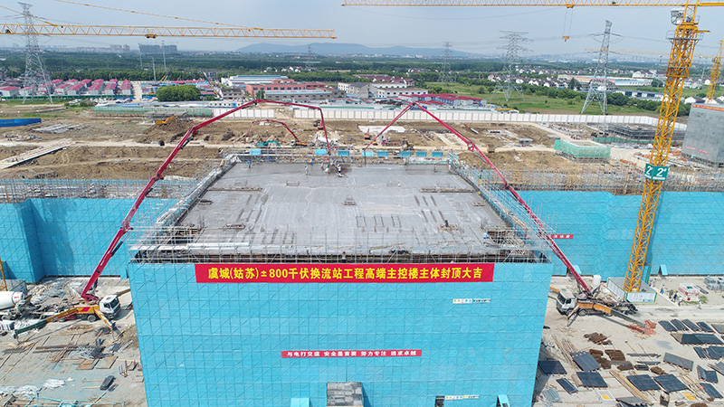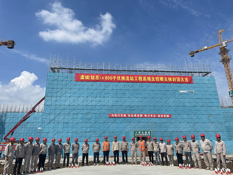 2021年07月18日14点48分,夏日炎炎,万里晴空,在一片烟花爆竹交织的喝彩声中,最后一方混凝土完成浇筑,虞城(姑苏)±800千伏换流站核心建筑物——主控楼主体结构完成顺利封顶。